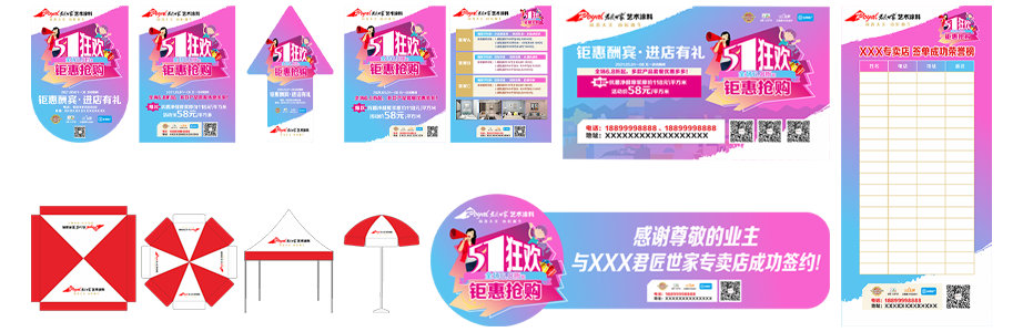 开业活动配套物(wù)料设计包括:宣传单、展架海报、地贴、吊旗、水牌、文(wén)化墙、签单牌、签单墙等。